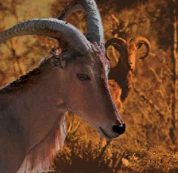 After scouring the area for awhile we decided that the 3 rams that our host described to us weren't in the high country as he figured. He said that sometimes in the early mornings he had seen them at the edge of a meadow at a lower elevation. so off we went to check it out. As we arrived at the meadow, on the far side, we saw the rams grazing at the bottom of a steep, mesquite covered ridge. As we worked closer to them to try to judge the trophy quality of the animals, they stood there alertly eyeing us, their long sandy colored manes and chaps rippling in the early morning breeze. But as happens with most Aoudad, before we could get a real good look they were gone up the mesquite covered slope of the ridge and out of sight. so it was back around to a road and up to the top of the ridge to try to ambush them within shooting range. But to our disappointment search as we might, no sign of any of them. Then we worked our way back down to where we had seen them last. Sure enough there they were, all three of them, standing almost in the middle of a meadow.