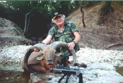 Finally our luck held for awhile and we were able to evaluate their horns. What we figured was the best ram we guessed was around 32 inches long. It had a distinctive sprig of white hair between it's horns .It gave us a chance for a shot at about 50 yards, which I took, hitting him in the lungs, verified by Thompson saying he could see the blood from the wound thru his binoculars. But as the old saying goes, the ram was dead but he didn't know it yet He walked off about 50 yards into a tall stand of milk weed plants. All I could see was the top of his back but our landowner said, put another into him, so I did. Still he didn't go down. He moved about another 50 yards standing broadside to us. I shot again and a large cloud of dust erupted from his body as the bullet struck him. Still no real indication that he was hurting too bad. Then he was off and up the steep ridge disappearing into the cedar choked slope. For us a mad rush to the top of the ridge, but no luck until the landowner spotted our quarry angling back down the ridge and away from us. My only choice was to sit on the edge of the drop-off, dangling my legs and taking an offhand shot nearly straight down and about 60 yards away. Luckily I connected with a spine shot and he dropped.